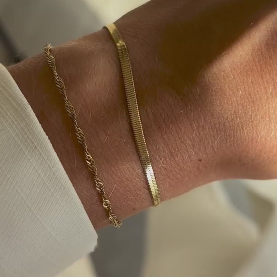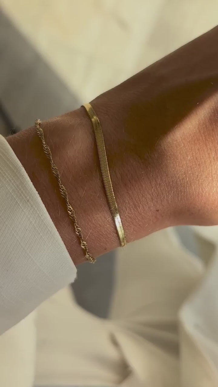 Elevate your everyday style with the Aura Herringbone Bracelet. This minimalist gold-colored flat snake chain bracelet offers a touch of dainty elegance, perfect for stacking or wearing on its own. Crafted for the modern woman, it's a versatile piece that complements any outfit, making it an ideal gift or a timeless addition to your own jewelry collection.